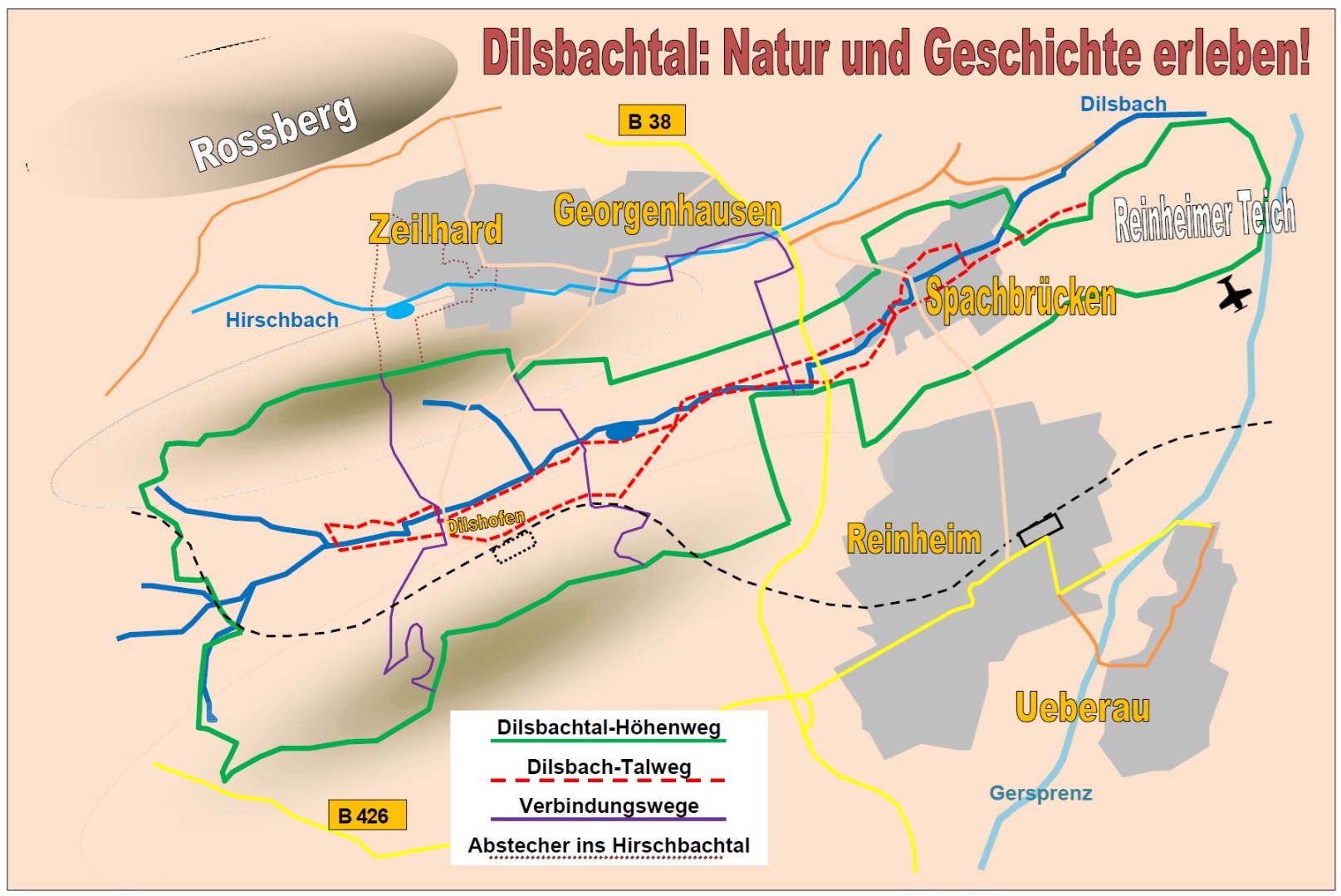 Kuckuck, Nachtigall und Eisvogel warten schon auf Sie. Der Höhenwanderweg umrundet mit 20 km das gesamte Dilsbachtal von den Quellen bei Ober-Ramstadt bis zur Mündung am Reinheimer Teich und bietet wunderbare Weitsichten in die angrenzenden Mittelgebirge. Unterwegs gibt es zwar keine Wegweiser, dafür aber unsere blauen Schildchen mit QR-Codes. Diese öffnen sich auf Ihrem Smartphone und präsentieren Ihnen genau das, was Sie an diesem Wegabschnitt wissen sollten. Ausführliche Infos finden Sie zusätzlich hier in weiteren Beiträgen. Wenn Sie Lust haben, auf dieser Webseite Bilder, Geschichten, historische Fakten und Informationen zu ergänzen, dann sind Sie herzlich willkommen! Schreiben Sie einfach an info@dilsbachtal.de!