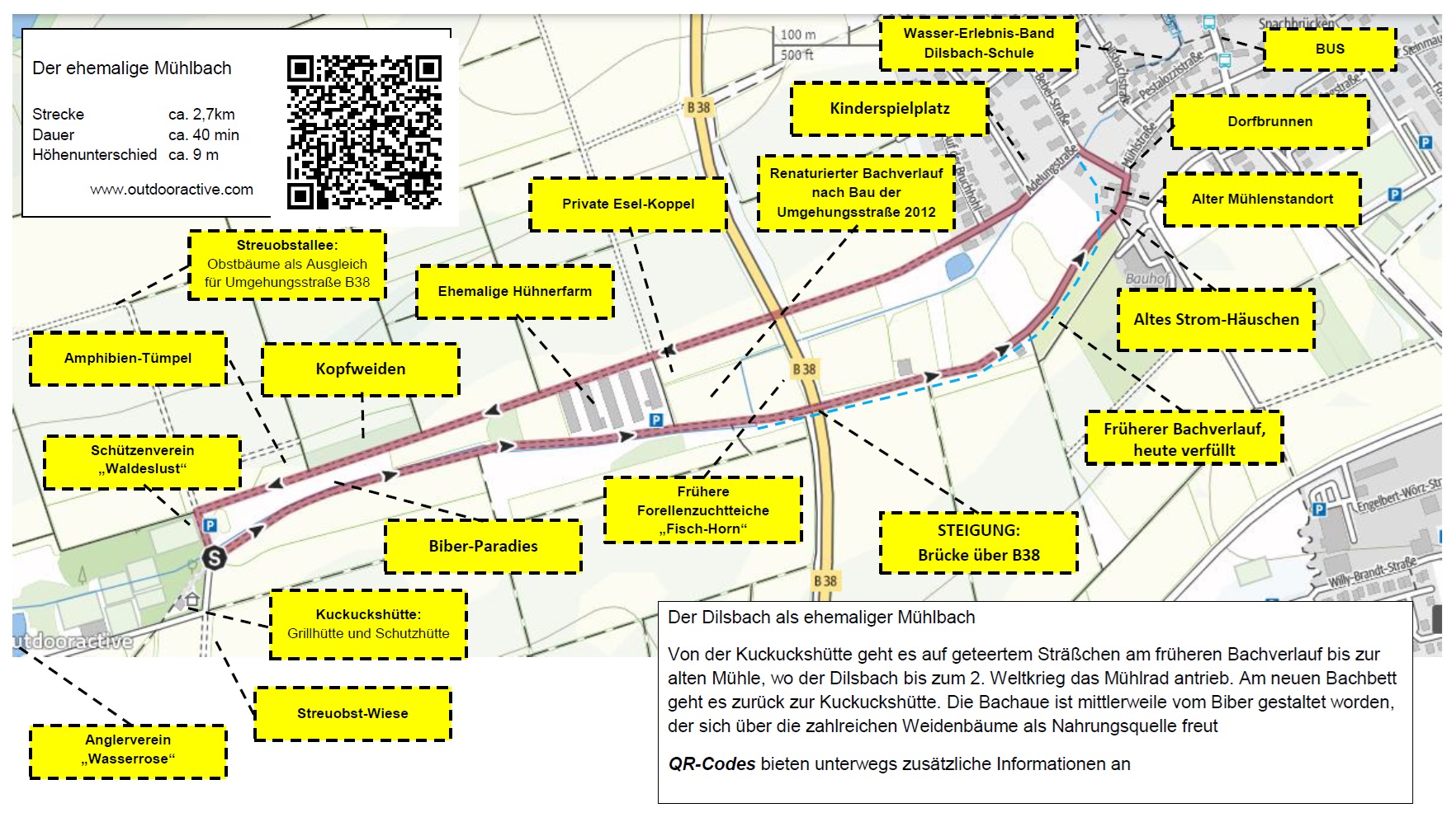 Von der Kuckuckshütte geht es am früheren Bachlauf bis zur alten Mühle, wo der Dilsbach bis zum 2. Weltkrieg das Mühlrad antrieb. Am neuen Bachbett geht es zurück zur Kuckuckshütte. Die Bachaue ist mittlerweile vom Biber gestaltet worden, der sich über die zahlreichen Weidenbäume als Nahrungsquelle freut.